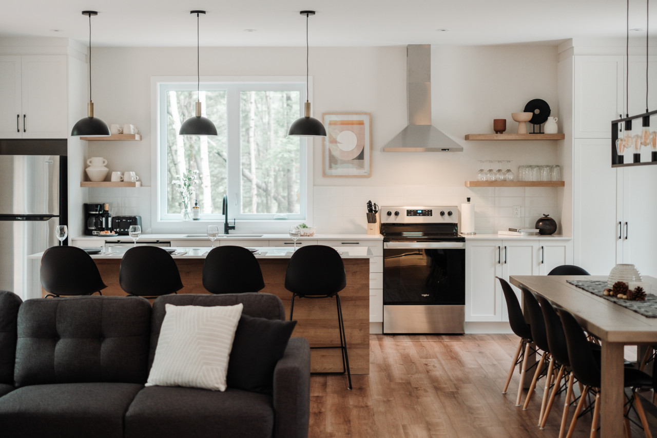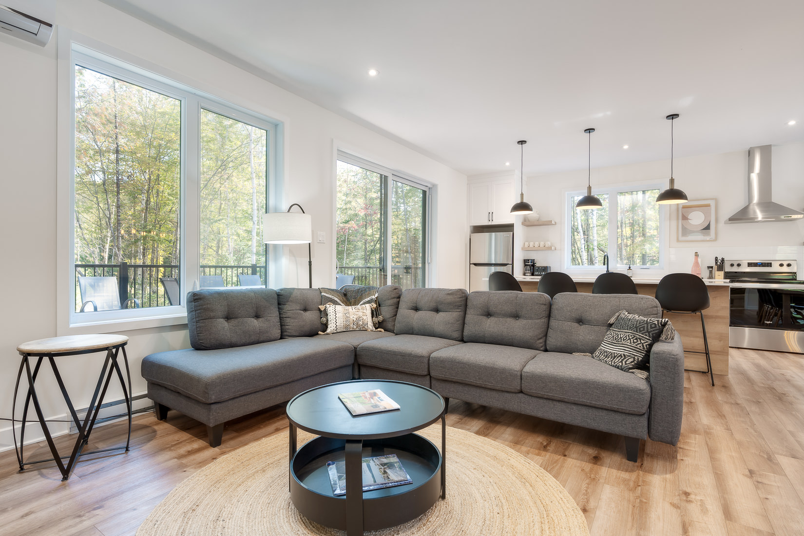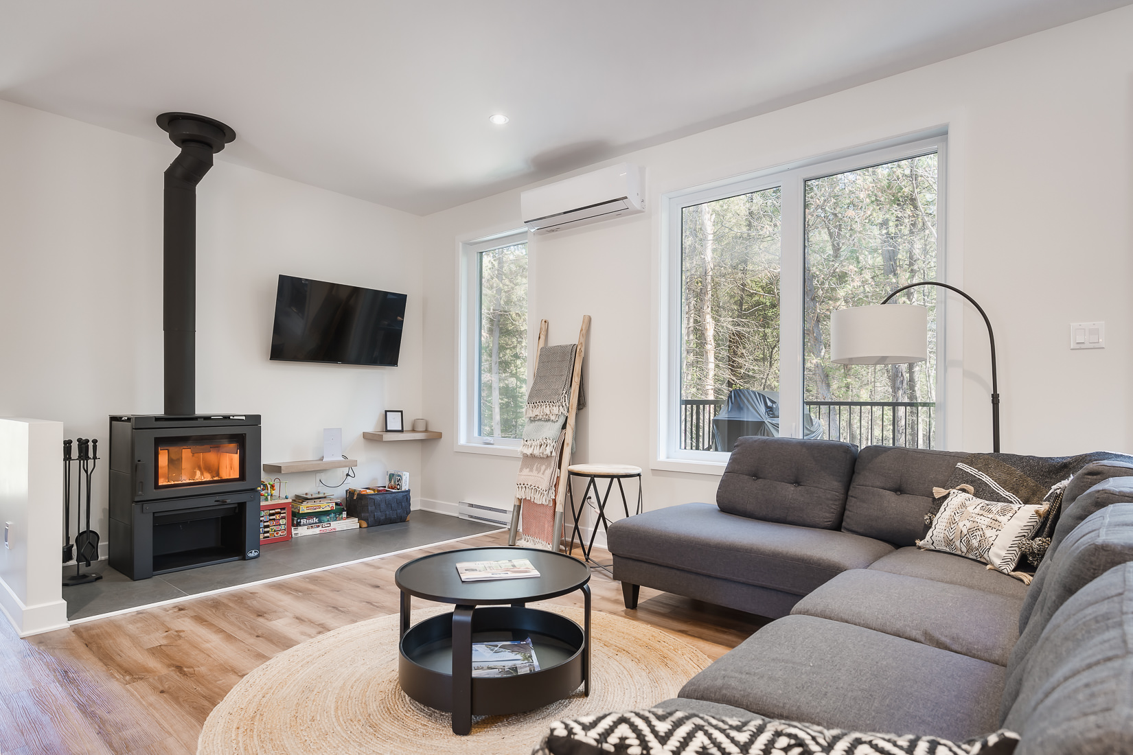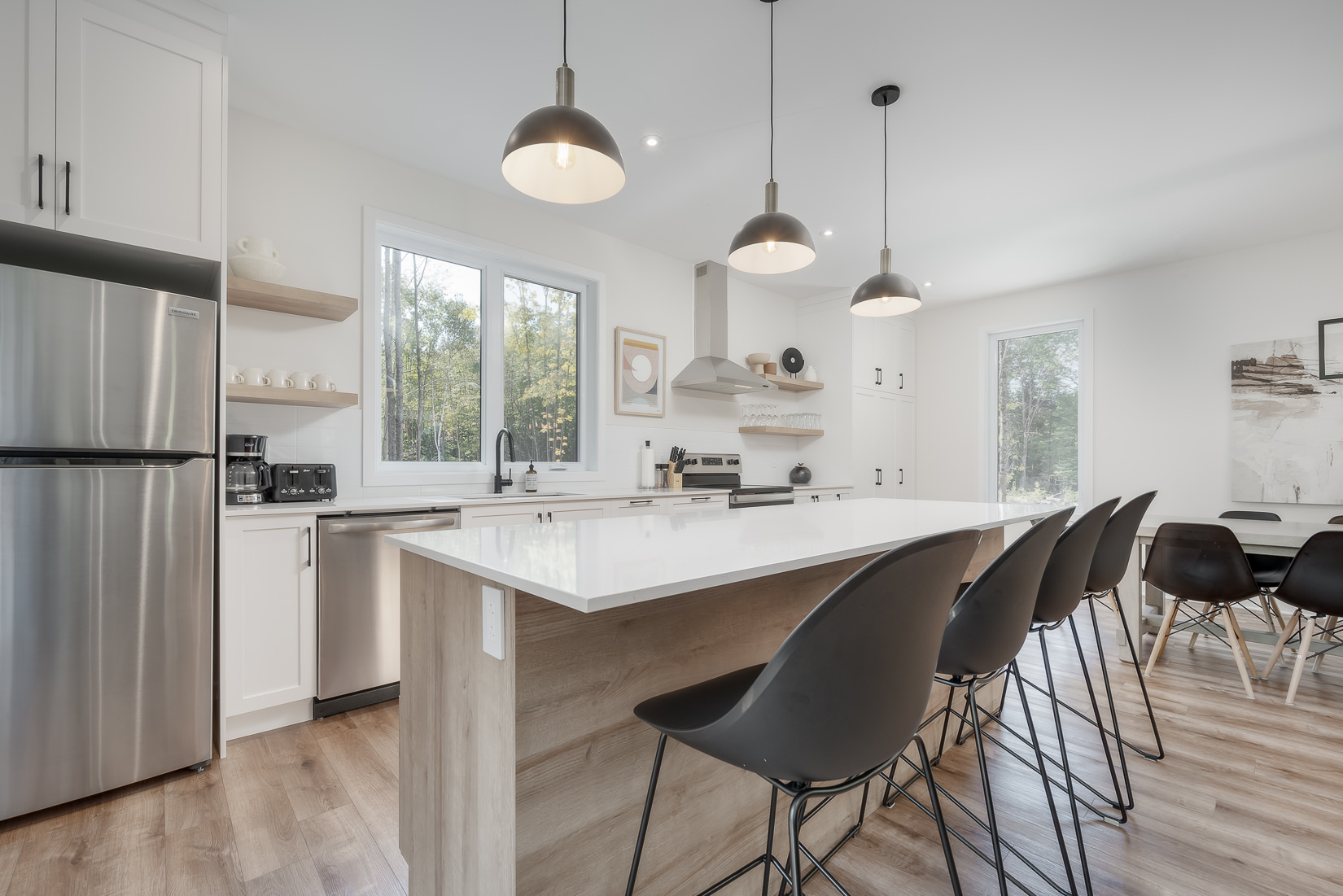 Set on a very large, private lot in the heart of the boreal forest, it features a warm wood‑burning fireplace, a spa, and a bright open‑concept layout with a spacious kitchen and oversized island.